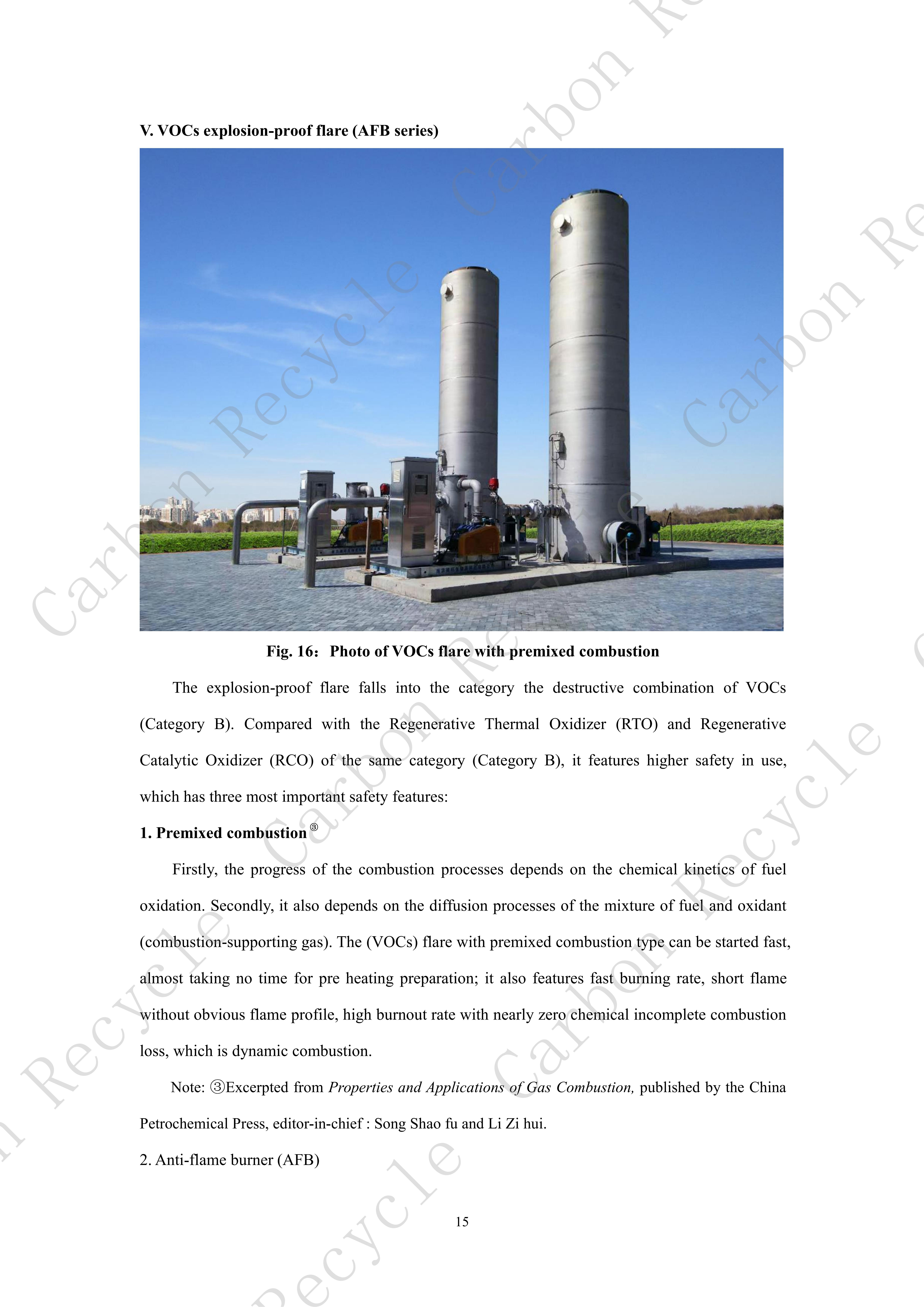 The explosion-proof flare falls into the category the destructive combination of VOCs (Category B). Compared with the Regenerative Thermal Oxidizer (RTO) and Regenerative Catalytic Oxidizer (RCO) of the same category (Category B), it features higher safety in use, which has three most important safety features: