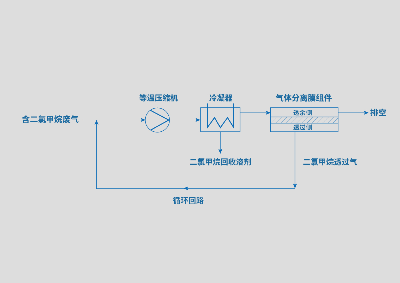 經(jīng)壓縮后的二氯甲烷有機廢氣進入冷凝器,氣體中的一部分二氯甲烷被冷凝下來,回收后的二氯甲烷溶液可以再次使用。而未冷凝的二氯甲烷氣體進入氣體分離膜組件,在壓力差的推動下,二氯甲烷透過膜,透余氣為脫除二氯甲烷后的氣體,通常為空氣。透過氣中富含二氯甲烷有機氣體,該氣體循環(huán)至壓縮機的進口進行復疊處理。由于二氯甲烷在循環(huán)回路中的濃度逐步上升,壓縮后進入冷凝器的二氯甲烷達到凝結濃度,二氯甲烷又被冷凝下來,成為可以被利用的液態(tài)二氯甲烷溶劑。