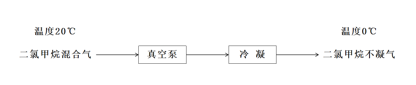以二氯甲烷和空氣的混合氣為例:20℃時(shí)二氯甲烷的飽和蒸氣壓是47.39KPa,由公式(2)計(jì)算可知,此時(shí)二氯甲烷在混合氣中的含量約為46.8%??紤]到真空泵前后的氣體壓力變換不大,將該混合氣降到0℃。0℃時(shí)二氯甲烷的飽和蒸氣壓是19.2KPa,二氯甲烷在混合氣中的比例約為18.9%。由此可以看出,采用圖(1)所示的流程,將二氯甲烷和空氣的混合氣由20℃降為0℃,約有74%的二氯甲烷冷凝析出變?yōu)橐后w溶劑。但是仍有26%的二氯甲烷不凝氣體隨混合氣體進(jìn)入后續(xù)廢氣處理裝置。