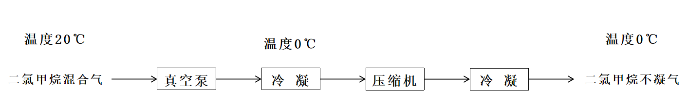 基于以上計(jì)算,將20℃時(shí)二氯甲烷和空氣的混合氣,壓縮到800KPa(表壓)后,再降到 0℃,混合氣中只含有2.1%的二氯甲烷不凝氣體,約有97.6%的二氯甲烷冷凝析出變?yōu)橐后w溶劑。進(jìn)一步降低溫度,仍有二氯甲烷冷凝析出。