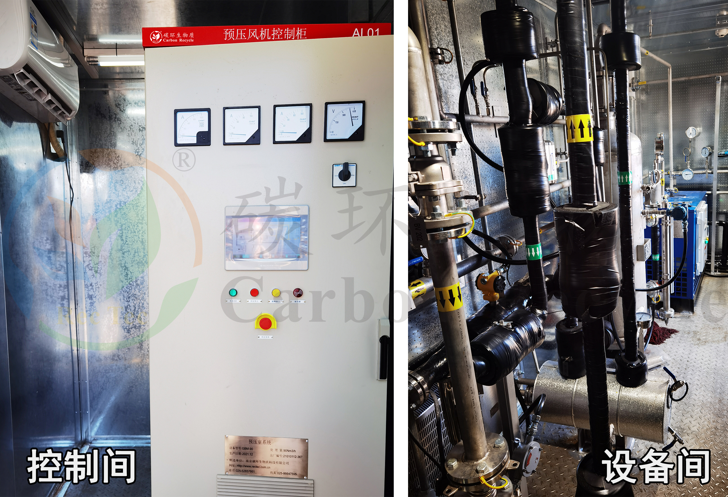 南京碳環(huán)90Nm3/h瓦斯氣預(yù)壓室系統(tǒng)為4臺顏巴赫J(rèn)620燃氣發(fā)電機組提供預(yù)燃室所需的燃氣,該系統(tǒng)采用集裝箱結(jié)構(gòu)。集裝箱內(nèi)分隔為設(shè)備間和控制間,設(shè)備間除含主設(shè)備(無油壓縮機、過濾器、冷干機等)外,還配備供暖、伴熱保溫、照明、通風(fēng)等設(shè)備(均為防爆產(chǎn)品),同時安裝有火警、瓦斯超限報警裝置,并將報警信號接入電廠DSC系統(tǒng)中,火警、瓦斯超限報警系統(tǒng)具備連跳功能;控制間除安裝了控制柜外,還安裝了照明、空調(diào)。整個系統(tǒng)布置緊湊、檢修通道寬敞,獲得用戶的好評。